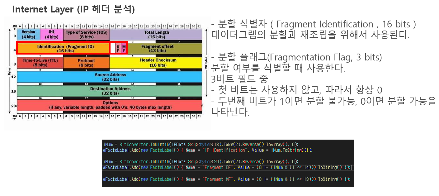 using System; using System.Collections.Generic; using System.ComponentModel; using System.Data; using System.Drawing; using System.Linq; using System.Text; using System.Threading.Tasks; using System.Windows.Forms; using SharpPcap; using System.Net; using System.Text.RegularExpressions; namespace whiteShark { public partial class Form1 : Form { public Form1() { InitializeComponent(); } private void button1_Click(object sender, EventArgs e) { List<string> NicName = new List<string>(); foreach (ICaptureDevice Temp in CaptureDeviceList.Instance) { string[] arrTemp = Temp.ToString().Split('\n'); NicName.Add(arrTemp[1].Substring("FriendlyName: ".Length)); } for (int iTemp = 0; iTemp < NicName.Count; ++iTemp) { Button aButton = new Button(); aButton.Text = NicName[iTemp]; aButton.Name = "Facto" + iTemp; aButton.Location = new Point(30, 30 + iTemp * 30); aButton.Click += new EventHandler(Facto_Click); Controls.Add(aButton); } (sender as Button).Enabled = false; } private void Print_MAC(byte[] EtherData) { int XMargin = 10; int XSize = 120; int XInterval = 10; int YMargin = 15; int YSize = 20; int YInterval = 10; List<FactoLabel> aFactoLabel = new List<FactoLabel>(); MessageBox.Show(string.Format("{0:X2}", EtherData[0])); string data1 = string.Format("{0:X2}", EtherData[0]); for (int iTemp = 1; iTemp < 6; ++iTemp) { data1 += string.Format("-{0:X2}", EtherData[iTemp]); } int inum2 = BitConverter.ToInt16(EtherData.Take(6).ToArray(), 0); aFactoLabel.Add(new FactoLabel() { Name = "Destination MAC", Value = data1.ToString() }); string data2 = string.Format("{0:X2}", EtherData[6]); for (int iTemp = 7; iTemp < 12; ++iTemp) { data2 += string.Format("-{0:X2}", EtherData[iTemp]); } aFactoLabel.Add(new FactoLabel() { Name = "Source MAC", Value = data2.ToString() }); int iNum = BitConverter.ToInt16(EtherData.Skip<byte>(12).Take(2).Reverse<byte>().ToArray(), 0); switch (iNum) { case 0x0200: data2 = "Xerox PUP"; break; case 0x0500: data2 = "Sprite"; break; case 0x0800: data2 = "IP"; break; case 0x0806: data2 = "Address resolution"; break; case 0x8035: data2 = "Reverse ARP"; break; case 0x809B: data2 = "AppleTalk protocol"; break; case 0x80F3: data2 = "AppleTalk ARPP"; break; case 0x8100: data2 = "IEEE 802.1Q VLAN taggingP"; break; case 0x8137: data2 = "IPX"; break; case 0x86dd: data2 = "IP protocol version 6"; break; case 0x9000: data2 = "used to test interfaces"; break; default: break; } aFactoLabel.Add(new FactoLabel() { Name = "L2Protocol", Value = data2 }); GroupBox aGroupBox = new GroupBox(); aGroupBox.Location = new Point(30, 22); aGroupBox.Name = "GroupMAC"; aGroupBox.Size = new Size(XMargin * 2 + XSize * 2 + XInterval, (YInterval + YSize) * aFactoLabel.Count + YMargin); int a = (YInterval + YSize) * aFactoLabel.Count + YMargin; aGroupBox.Text = "MAC Layer"; for (int Count = 0; Count < aFactoLabel.Count; ++Count) { Label aLabel = new Label(); aLabel.TextAlign = ContentAlignment.MiddleCenter; aLabel.Text = aFactoLabel[Count].Name; aLabel.Name = "****"; aLabel.Size = new Size(XSize, YSize); aLabel.Location = new Point(XMargin, (YSize + YInterval) * Count + YMargin); aLabel.BorderStyle = BorderStyle.FixedSingle; aGroupBox.Controls.Add(aLabel); aLabel = new Label(); aLabel.TextAlign = ContentAlignment.MiddleCenter; aLabel.Text = aFactoLabel[Count].Value; aLabel.Name = "****1"; aLabel.Size = new Size(XSize+5, YSize); aLabel.Location = new Point(XMargin + XSize + XInterval, (YSize + YInterval) * Count + YMargin); aLabel.BorderStyle = BorderStyle.FixedSingle; aGroupBox.Controls.Add(aLabel); } Controls.Add(aGroupBox); }//1층 private void Print_IP(byte[] IPData) { int XMargin = 10; int XSize = 120; int XInterval = 10; int YMargin = 15; int YSize = 20; int YInterval = 10; List<FactoLabel> aFactoLabel = new List<FactoLabel>(); byte byteTemp = IPData[14]; aFactoLabel.Add(new FactoLabel() { Name = "IP Version", Value = "IPv" + (byteTemp >> 4).ToString() }); aFactoLabel.Add(new FactoLabel() { Name = "IP Head Length", Value = ((byteTemp & 0x0F) * 4).ToString() + " Bytes" }); byteTemp = IPData[15]; aFactoLabel.Add(new FactoLabel() { Name = "IP TOS", Value = string.Format("0x{0:X2}", byteTemp) }); int iNum = BitConverter.ToUInt16(IPData.Skip<byte>(16).Take(2).Reverse().ToArray(), 0); aFactoLabel.Add(new FactoLabel() { Name = "IP Total Length", Value = iNum.ToString() + " Bytes" }); iNum = BitConverter.ToUInt16(IPData.Skip<byte>(18).Take(2).Reverse().ToArray(), 0); aFactoLabel.Add(new FactoLabel() { Name = "IP IDentification", Value = iNum.ToString()}); iNum = BitConverter.ToUInt16(IPData.Skip<byte>(20).Take(2).Reverse().ToArray(), 0); aFactoLabel.Add(new FactoLabel() { Name = "Fragment DF", Value = (0 != (iNum & (1 << 14))).ToString() }); aFactoLabel.Add(new FactoLabel() { Name = "Fragment MF", Value = (0 != (iNum & (1 << 13))).ToString() }); aFactoLabel.Add(new FactoLabel() { Name = "Fragment Offset", Value = (iNum & 0x1FFF).ToString() }); byteTemp = IPData[22]; aFactoLabel.Add(new FactoLabel() { Name = "Time To Live", Value = byteTemp.ToString() }); byteTemp = IPData[23]; string temp = ""; switch (byteTemp) { case 0: temp = "IPPROTO_IP"; break; case 1: temp = "IPPROTO_ICMP"; break; case 2: temp = "IPPROTO_IGMP"; break; case 4: temp = "IPPROTO_IPIP"; break; case 6: temp = "IPPROTO_TCP"; break; case 8: temp = "IPPROTO_EGP"; break; case 12: temp = "IPPROTO_PUP"; break; case 17: temp = "IPPROTO_UDP"; break; case 22: temp = "IPPROTO_IDP"; break; case 29: temp = "IPPROTO_TP"; break; case 33: temp = "IPPROTO_DCCP"; break; case 41: temp = "IPPROTO_IPV6"; break; default: break; } aFactoLabel.Add(new FactoLabel() { Name = "L3 Protocol", Value = temp }); iNum = BitConverter.ToUInt16(IPData.Skip<byte>(24).Take(2).Reverse().ToArray(), 0); aFactoLabel.Add(new FactoLabel() { Name = "Checksum", Value = string.Format("0x{0:X4}", iNum) }); IPAddress aiPAddress = new IPAddress(IPData.Skip<byte>(26).Take(4).ToArray()); aFactoLabel.Add(new FactoLabel() { Name = "Source IP", Value = aiPAddress.ToString() }); aiPAddress = new IPAddress(IPD