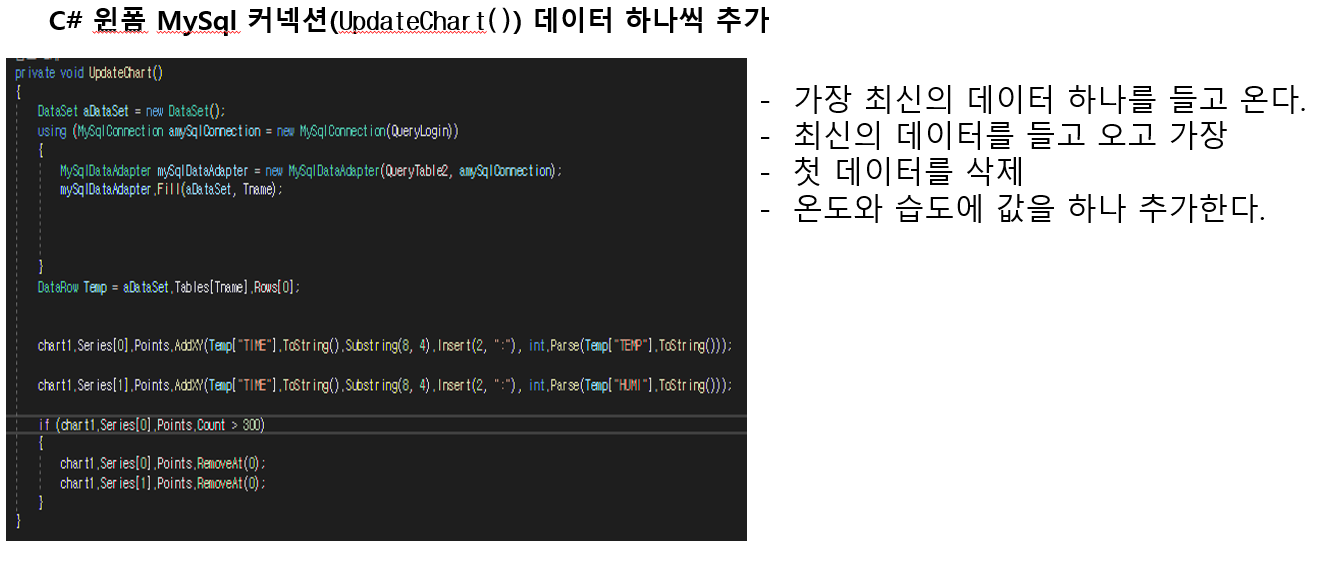 using MySql.Data.MySqlClient; using System; using System.Collections.Generic; using System.ComponentModel; using System.Data; using System.Drawing; using System.Linq; using System.Text; using System.Threading.Tasks; using System.Windows.Forms; namespace dht_Sensor { public partial class Form1 : Form { private static string Tname = "tblSensorDHT11"; private static string QueryLogin = "SERVER=192.168.0.155 ; DATABASE = mydb; UID = root ; PASSWORD = 1234;"; private static string QueryTable = "SELECT * FROM " + Tname + " ORDER BY TIME DESC LIMIT "; private static string QueryTable12 = QueryTable + 300 ; private static string QueryTable2 = QueryTable + 1 ; private bool TimerStatus; public void RefreshOn() { TimerStatus = true; timer1.Start(); button2.Text = "그래프 정지"; } public void RefreshOff() { TimerStatus = false; timer1.Stop(); button2.Text = "시작"; } public void RefreshToggle() { if(false==TimerStatus)//타이머 꺼져있을 때 { RefreshOn(); } else { RefreshOff(); } } public Form1() { InitializeComponent(); } private void Form1_Load(object sender, EventArgs e) { RefreshOn(); DataSet aDataSet = new DataSet(); using(MySqlConnection amySqlConnection = new MySqlConnection(QueryLogin)) { MySqlDataAdapter mySqlDataAdapter = new MySqlDataAdapter(QueryTable12,amySqlConnection); mySqlDataAdapter.Fill(aDataSet,Tname); List<int> TempData = new List<int>(); List<int> HumiData = new List<int>(); List<string> Time = new List<string>(); foreach (DataRow item in aDataSet.Tables[Tname].Rows) { TempData.Add(int.Parse(item["TEMP"].ToString())); HumiData.Add(int.Parse(item["HUMI"].ToString())); Time.Add(item["TIME"].ToString().Substring(8, 4).Insert(2,":")); } //MessageBox.Show(TempData.Count.ToString()); //MessageBox.Show(HumiData.Count.ToString()); TempData.Reverse(); HumiData.Reverse(); Time.Reverse(); chart1.Series[0].Points.DataBindXY(Time, TempData); chart1.ChartAreas[0].AxisX.Minimum = 0; chart1.ChartAreas[0].AxisY.Maximum = 100; chart1.Series[0].LegendText = "온도 ºC"; chart1.Series[1].Points.DataBindXY(Time,HumiData); chart1.Series[1].LegendText = "습도 %"; } } private void button1_Click(object sender, EventArgs e) { UpdateChart(); } private void timer1_Tick(object sender, EventArgs e) { UpdateChart(); } private void UpdateChart() { DataSet aDataSet = new DataSet(); using (MySqlConnection amySqlConnection = new MySqlConnection(QueryLogin)) { MySqlDataAdapter mySqlDataAdapter = new MySqlDataAdapter(QueryTable2, amySqlConnection); mySqlDataAdapter.Fill(aDataSet, Tname); } DataRow Temp = aDataSet.Tables[Tname].Rows[0]; chart1.Series[0].Points.AddXY(Temp["TIME"].ToString().Substring(8, 4).Insert(2, ":"), int.Parse(Temp["TEMP"].ToString())); chart1.Series[1].Points.AddXY(Temp["TIME"].ToString().Substring(8, 4).Insert(2, ":"), int.Parse(Temp["HUMI"].ToString())); if (chart1.Series[0].Points.Count > 300) { chart1.Series[0].Points.RemoveAt(0); chart1.Series[1].Points.RemoveAt(0); } } private void button2_Click(object sender, EventArgs e) { RefreshToggle(); } } }'C#' 카테고리의 다른 글