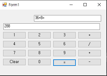 using System; using System.Collections; using System.Collections.Generic; using System.ComponentModel; using System.Data; using System.Drawing; using System.Linq; using System.Text; using System.Threading.Tasks; using System.Windows.Forms; namespace WindowsFormsApp1 { public partial class Form1 : Form { private bool newButton; // 새로 숫자가 시작되어야 하는 것을 말하는 flag private string number1, number2; private int Cal = 0; public Form1() { InitializeComponent(); } private void btn1_Click(object sender, EventArgs e) { if (newButton == false) { number1 += "1"; txtResult1.Text = number1; } else { number2 += "1"; txtResult1.Text = number2; } } private void btn2_Click(object sender, EventArgs e) { if (newButton == false) { number1 += "2"; txtResult1.Text = number1; } else { number2 += "2"; txtResult1.Text = number2; } } private void btn3_Click(object sender, EventArgs e) { if (newButton == false) { number1 += "3"; txtResult1.Text = number1; } else { number2 += "3"; txtResult1.Text = number2; } } private void btn4_Click(object sender, EventArgs e) { if (newButton == false) { number1 += "4"; txtResult1.Text = number1; } else { number2 += "4"; txtResult1.Text = number2; } } private void btn5_Click(object sender, EventArgs e) { if (newButton == false) { number1 += "5"; txtResult1.Text = number1; } else { number2 += "5"; txtResult1.Text = number2; } } private void btn6_Click(object sender, EventArgs e) { if (newButton == false) { number1 += "6"; txtResult1.Text = number1; } else { number2 += "6"; txtResult1.Text = number2; } } private void btn7_Click(object sender, EventArgs e) { if (newButton == false) { number1 += "7"; txtResult1.Text = number1; } else { number2 += "7"; txtResult1.Text = number2; } } private void btn8_Click(object sender, EventArgs e) { if (newButton == false) { number1 += "8"; txtResult1.Text = number1; } else { number2 += "8"; txtResult1.Text = number2; } } private void btn9_Click(object sender, EventArgs e) { if (newButton == false) { number1 += "9"; txtResult1.Text = number1; } else { number2 += "9"; txtResult1.Text = number2; } } private void btn0_Click(object sender, EventArgs e) { if (newButton == false) { number1 += "0"; txtResult1.Text = number1; } else { number2 += "0"; txtResult1.Text = number2; } } private void btnMulti_Click(object sender, EventArgs e) { newButton = true; textBox1.Text = number1 + " * "; Cal = 1; } private void btnDiv_Click(object sender, EventArgs e) { newButton = true; textBox1.Text = number1 + " / "; Cal = 2; } private void btnPlus_Click(object sender, EventArgs e) { newButton = true; textBox1.Text = number1 + " + "; Cal = 3; } private void btnMin_Click(object sender, EventArgs e) { newButton = true; textBox1.Text = number1 + " - "; Cal = 4; } private void btnequal_Click_1(object sender, EventArgs e) { double num1 = System.Convert.ToDouble(number1); double num2 = System.Convert.ToDouble(number2); double result; if (Cal == 1) { textBox1.Text = number1 + "*" + number2 + "="; result = num1 * num2; txtResult1.Text = result.ToString(); } else if (Cal == 2) { textBox1.Text = number1 + "/" + number2 + "="; result = num1 / num2; txtResult1.Text = result.ToString(); } else if (Cal == 3) { textBox1.Text = number1 + "+" + number2 + "="; result = num1 + num2; txtResult1.Text = result.ToString(); } else if (Cal == 4) { textBox1.Text = number1 + "-" + number2 + "="; result = num1 - num2; txtResult1.Text = result.ToString(); } } private void button1_Click(object sender, EventArgs e) { number1 = ""; number2 = ""; txtResult1.Text = ""; textBox1.Text = ""; } } }