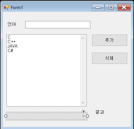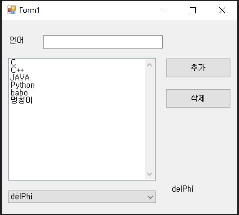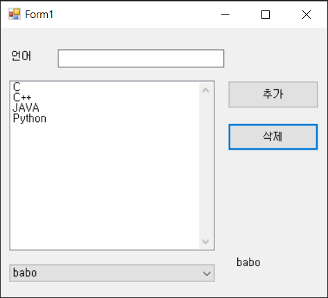 using System; using System.Collections.Generic; using System.ComponentModel; using System.Data; using System.Drawing; using System.Linq; using System.Text; using System.Threading.Tasks; using System.Windows.Forms; namespace testList { public partial class Form1 : Form { public Form1() { InitializeComponent(); } private void button1_Click(object sender, EventArgs e) { if(textBox1.Text!= "") { listBox1.Items.Add(textBox1.Text); comboBox1.Items.Add(textBox1.Text); textBox1.Text = ""; } textBox1.Focus(); } private void button2_Click(object sender, EventArgs e) { if (listBox1.SelectedIndex > -1) { listBox1.Items.RemoveAt(listBox1.SelectedIndex); } } private void Form1_Load(object sender, EventArgs e) { } private void comboBox1_SelectedIndexChanged(object sender, EventArgs e) { label2.Text = comboBox1.SelectedItem.ToString(); } } }