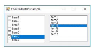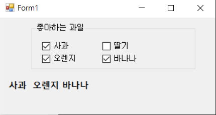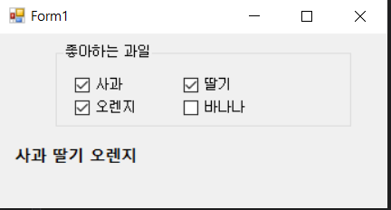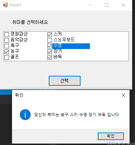 using System; using System.Windows.Forms; namespace CheckListBoxApp { public partial class Form1 : Form { public Form1() { InitializeComponent(); } private void button1_Click(object sender, EventArgs e) { //동적 변수 뒤에 값을 넣는 순간 자동으로 자료형을 지정해준다. var strTemp = ""; foreach (var item in checkedListBox1.CheckedItems) { strTemp += item.ToString(); strTemp += " "; } MessageBox.Show($"당신의 취미는 {strTemp}입니다", "확인",MessageBoxButtons.OK,MessageBoxIcon.Information); } } }