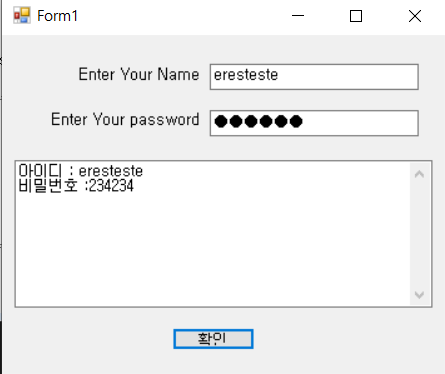 using System; using System.Collections.Generic; using System.ComponentModel; using System.Data; using System.Drawing; using System.Linq; using System.Text; using System.Threading.Tasks; using System.Windows.Forms; namespace TextBoxTest { public partial class Form1 : Form { public Form1() { InitializeComponent(); } string teststring1,teststring2; private void button1_Click(object sender, EventArgs e) { //textBox3.Text = "아이디 : " + textBox1.Text + " \r\n비밀번호 :" + textBox2.Text; textBox3.Text = $"아이디 : {textBox1.Text} \n 비밀번호 : {textBox2.Text}"; //admin의 대소문자 구분을 없이 대문자만 출력. if((textBox1.Text.ToUpper() == "ADMIN") && (textBox2.Text.ToUpper() == "P@SSW0RD!")) MessageBox.show("관리자 로그인"); } } }처음 두개의 박스에는 MaxLength와