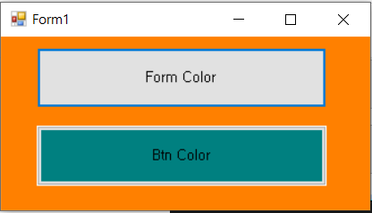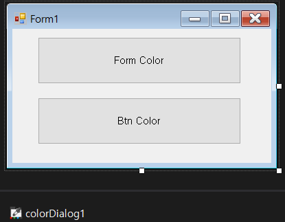 using System; using System.Drawing; using System.Windows.Forms; namespace ColorDialog { public partial class Form1 : Form { public Form1() { InitializeComponent(); } private void button1_Click(object sender, EventArgs e) { if(colorDialog1.ShowDialog()==DialogResult.OK) { this.BackColor = colorDialog1.Color; } } private void button2_Click(object sender, EventArgs e) { if (colorDialog1.ShowDialog() == DialogResult.OK) { button1.BackColor = colorDialog1.Color; button2.BackColor = colorDialog1.Color; } } } }