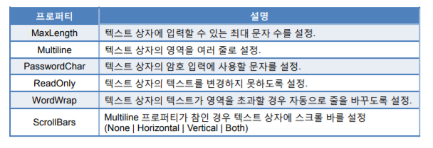 사용자가 직접 텍스트를 입력할 수 있는 기본적인 컨트롤로서 사용자로부터 값을 입력 받거나 애플리케이션의 실행 결과를 출력하고자 할 때 유용하게 사용할 수 있음.
