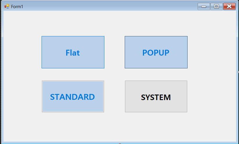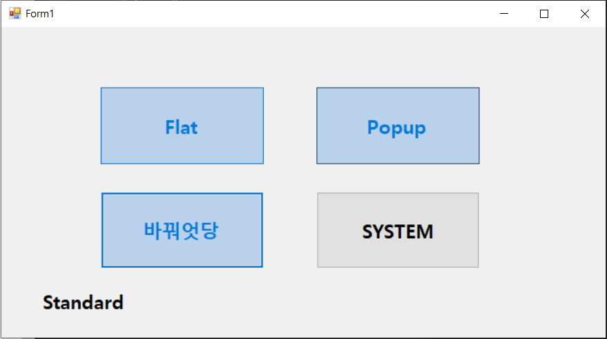 using System; using System.Collections.Generic; using System.ComponentModel; using System.Data; using System.Drawing; using System.Drawing.Text; using System.Linq; using System.Text; using System.Threading.Tasks; using System.Windows.Forms; namespace ButtonTest { public partial class Form1 : Form { protected int a,b,c,d = 0; public Form1() { InitializeComponent(); } private void Form1_Load(object sender, EventArgs e) { label1.Text = ""; } private void btnFlat_Click(object sender, EventArgs e) { label1.Text = FlatStyle.Flat.ToString(); if (a % 2 == 0) { btnFlat.Text = "바꿔엇당"; a++; } else if (a % 2 == 1) { btnFlat.Text = "Flat"; a++; } } private void btnPopup_Click(object sender, EventArgs e) { label1.Text = FlatStyle.Popup.ToString(); if (b % 2 == 0) { btnPopup.Text = "바꿔엇당"; b++; } else if (b % 2 == 1) { btnPopup.Text = "Popup"; b++; } } private void btnStandard_Click(object sender, EventArgs e) { label1.Text = FlatStyle.Standard.ToString(); if (c % 2 == 0) { btnStandard.Text = "바꿔엇당"; c++; } else if (c % 2 == 1) { btnStandard.Text = "Standard"; c++; } } private void btnSystem_Click(object sender, EventArgs e) { label1.Text = FlatStyle.System.ToString(); label1.Text = "System"; if (d % 2 == 0) { btnSystem.Text = "바꿔엇당"; d++; } else if(d%2==1) { btnSystem.Text = "System"; d++; } } } }