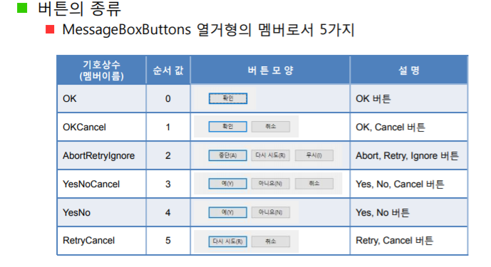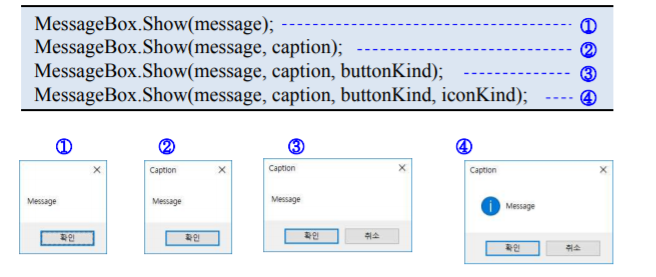 - MessageBox 클래스의 멤버인 Show() 메소드 이용