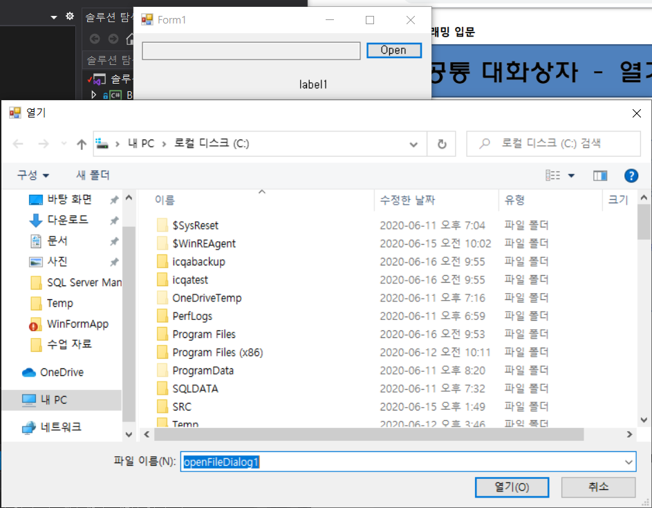 private void button1_Click(object sender, EventArgs e) { openFileDialog1.ShowDialog(); }요것만 실행하면 위와 같이 나온다. OpenFileDialog를 꼭 추가한다.