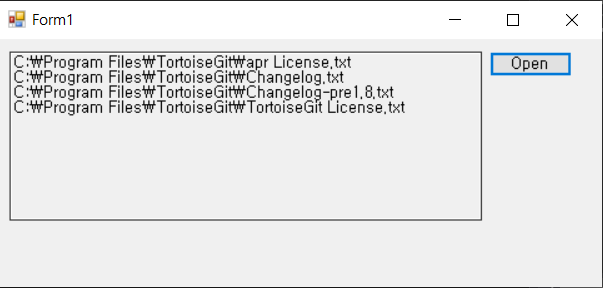 private void button1_Click(object sender, EventArgs e) { openFileDialog1.FileName = ""; openFileDialog1.InitialDirectory = @"C:\"; //찾기 시작할 위치 지정 openFileDialog1.Filter = "텍스트 파일(*.txt)|*.txt";//파일 확장자 지정 openFileDialog1.FilterIndex = 1; openFileDialog1.RestoreDirectory = true; openFileDialog1.Multiselect = true; //프로퍼티 창에서도 가능 openFileDialog1.ShowDialog(); foreach(string strTmp in openFileDialog1.FileNames) { textBox1.Text += strTmp; textBox1.Text += Environment.NewLine; } }