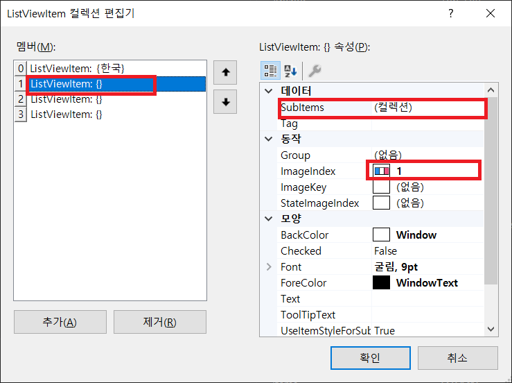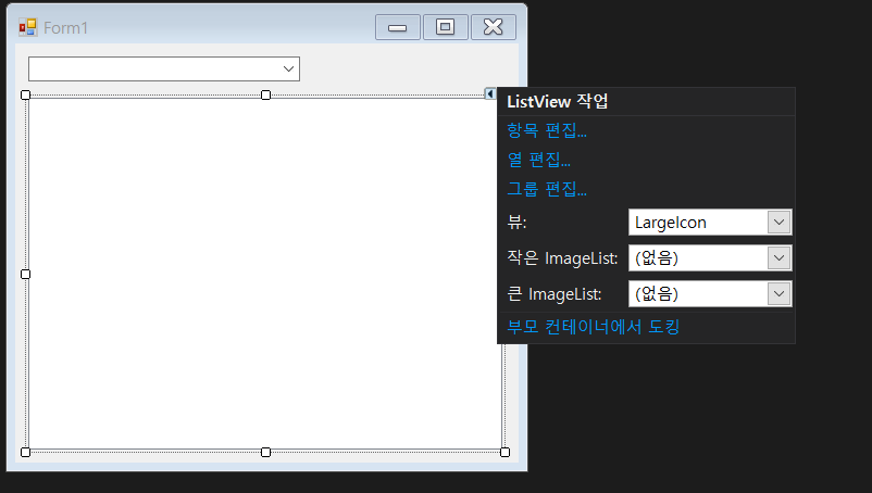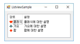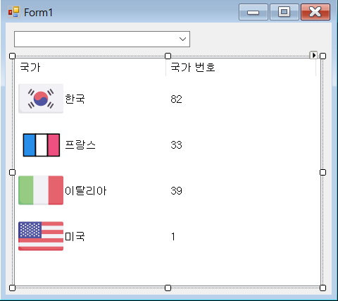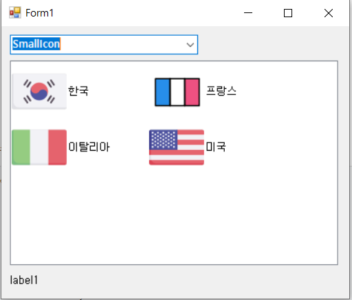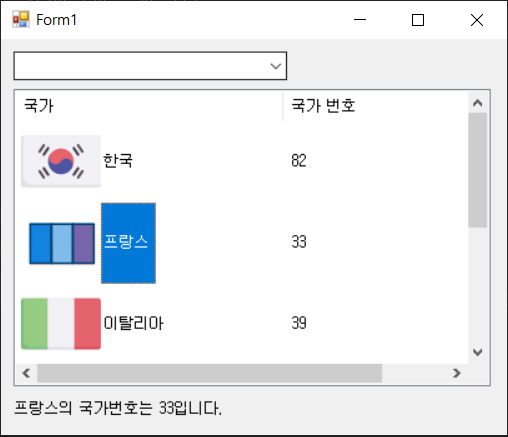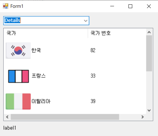 private void comboBox1_SelectedIndexChanged(object sender, EventArgs e) { switch (comboBox1.SelectedIndex) { case 0: //LargeIcon listView1.View = View.LargeIcon; break; case 1: //Details listView1.View = View.Details; break; case 2: //SmallICOn listView1.View = View.SmallIcon; break; case 3: //List listView1.View = View.List; break; case 4: //tile listView1.View = View.Tile; break; default: listView1.View = View.LargeIcon; break; } } private void listView1_SelectedIndexChanged(object sender, EventArgs e) { foreach (ListViewItem item in listView1.SelectedItems) { ListViewSubItemCollection subItem = item.SubItems; //컴파일 과정에서 selectedItem[0]이 subitem[0]에 들어가고 다음 subitem[1]에 국가번호 label1.Text = subItem[0].Text + "의 국가번호는 " + subItem[1].Text + "입니다."; } }