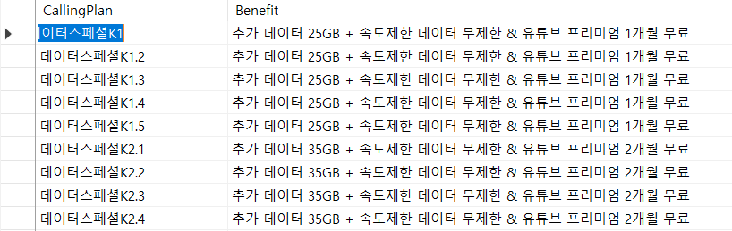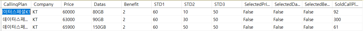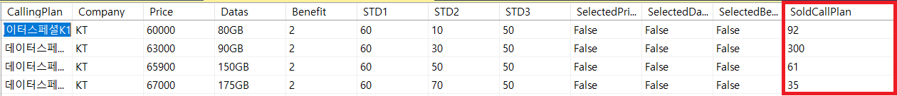 를 쿼리문(두번째 using) 으로 셀렉트할 때 CallingPlan을 키 값으로 SoldCallPlan을 내림차순으로 정렬해서 상위 5개의 요금제를 추출해서 그래프로 띄웠다. 첫번째 using문은 usertbl에서 해당 프로그램을 사용중인 사용자의 숫자를 알아내서 usercount변수에 저장하기 위한 부분이다. 오른쪽 위 그래프의 데이터를 추출하는데 사용된다.