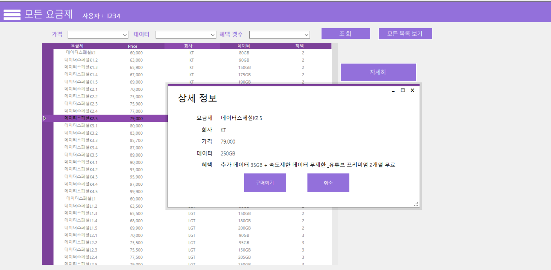 앞선 All_Products 에서 데이터 그리드뷰의 셀을 클릭하고 자세히를 누르게 되면 뜨는 폼이다. 요금제에 대한 상세한 혜택정보와 구매하기 버튼을 통해서 사용자의 성향을 변화시킨다.