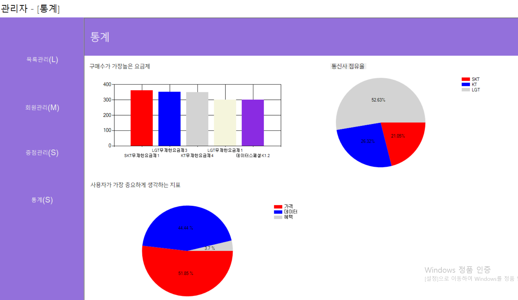 왼쪽 위의 막대그래프부터 설명하자면 데이터베이스에 나와있는 요금제 별 구매수