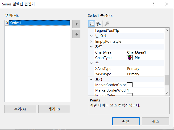그래프의 Series에서 속성을 다음과 같이 건드리면 원형그래프가 된다.