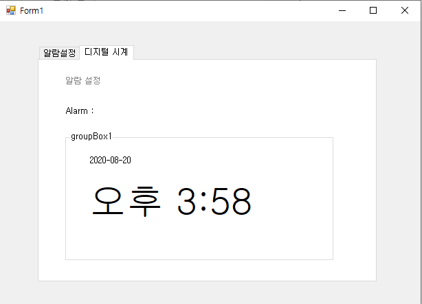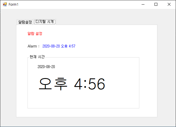 private void timer1_Tick(object sender, EventArgs e) { DateTime cTime = DateTime.Now; lblDate.Text = cTime.ToShortDateString(); lblTime.Text = cTime.ToShortTimeString(); if(setAlarm==true) { if(dDay==DateTime.Today && cTime.Hour==tTime.Hour && cTime.Minute==tTime.Minute) { setAlarm = false; MessageBox.Show("Alarm!!!!!"); } } }interval이 1000 즉 1초마다 현재시간을 의미하는 cTime에 현재시간을 넣어준다. 이 cTime을 날짜와 시간으로 각각 나눠서 2번탭의 lblDate와 lblTime에 현재시간으로 띄워준다. 알람이 설정되어 있고, 현재 시간과 설정한 알람이 전부 일치하면 메세지박스를 띄우고 setAlarm을 false를 한다.